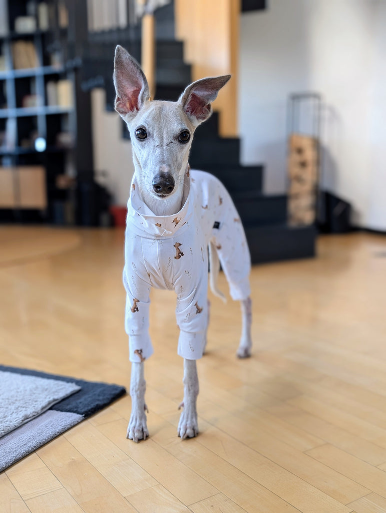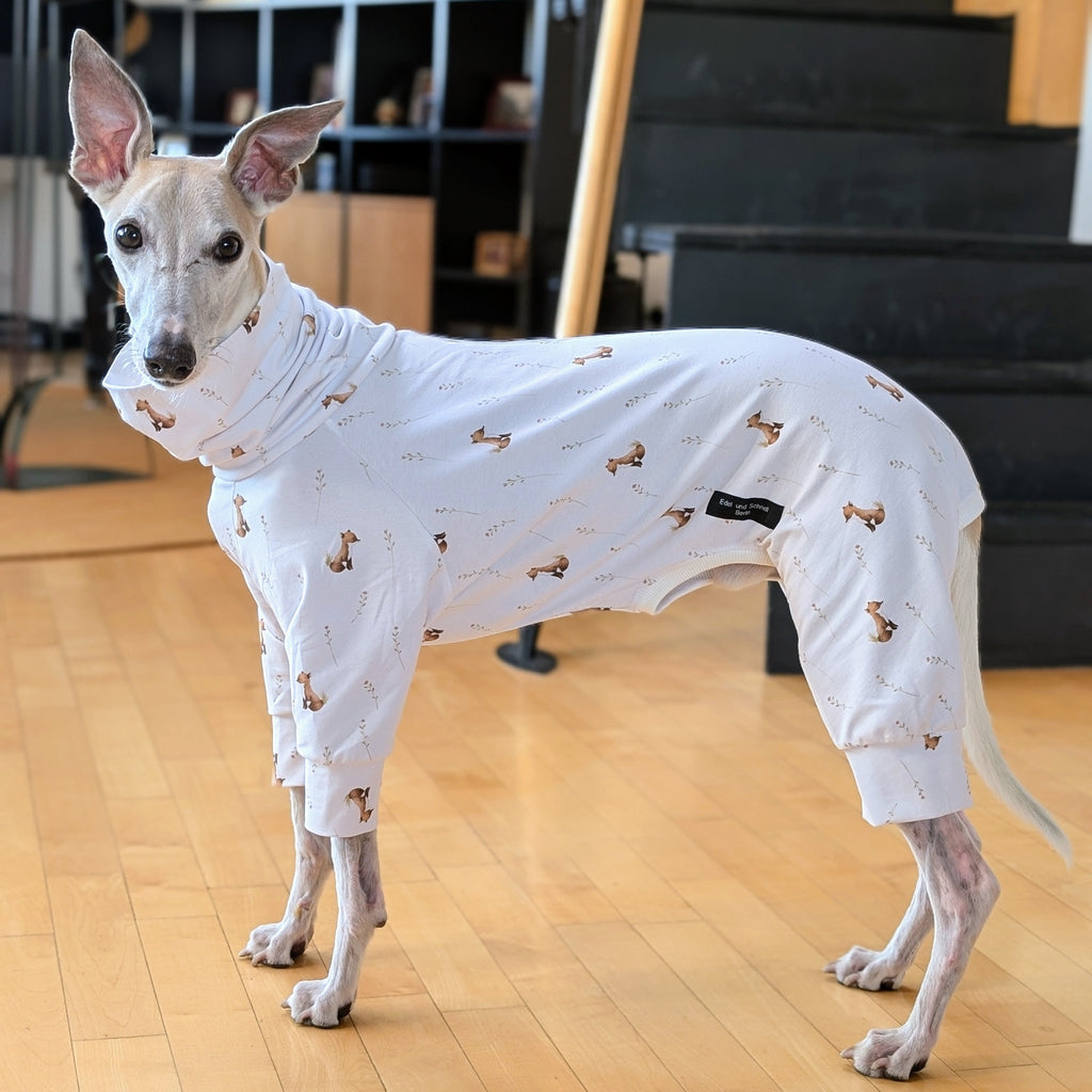 Hundepyjama aus Bio-Baumwolljersey – Wollweiß mit Fuchs-Motiv
