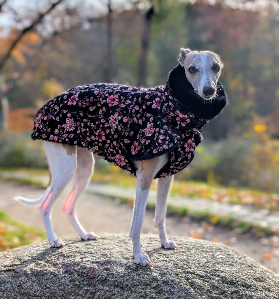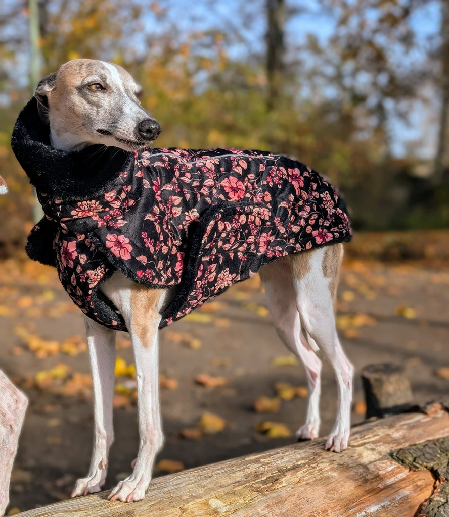 Edler Hundemantel für Windhunde Ridgebacks und weitere – schwarzer Samtstepp mit floralem Muster & Klettverschluss