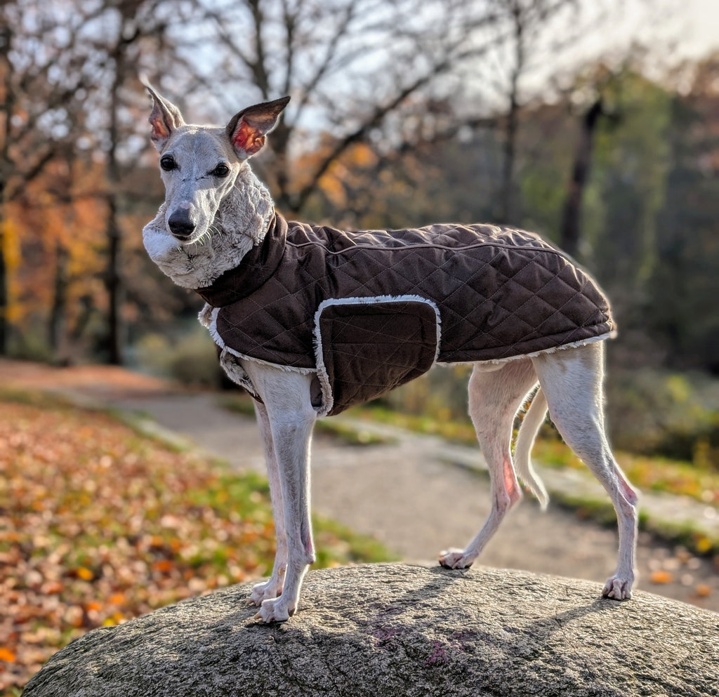 Hundemantel für Windhunde Ridgebacks und weitere – Alcantara Stepp Mokka & Kunstfell gefüttert