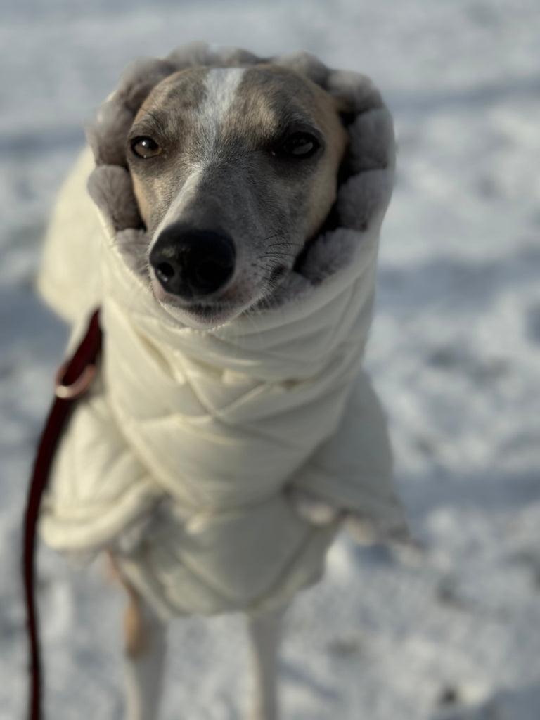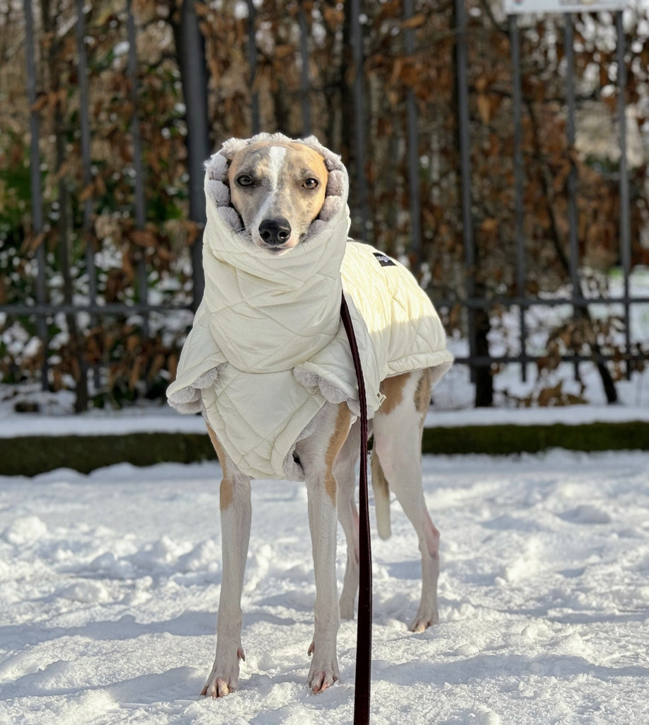 Für richtige Frostbeulen Weißer Steppmantel gefüttert mit extra dickem Kunstpelz mit Reißverschluss für Whippets, Galgos, Greyhounds, Windhunde, Ridgebacks etc.