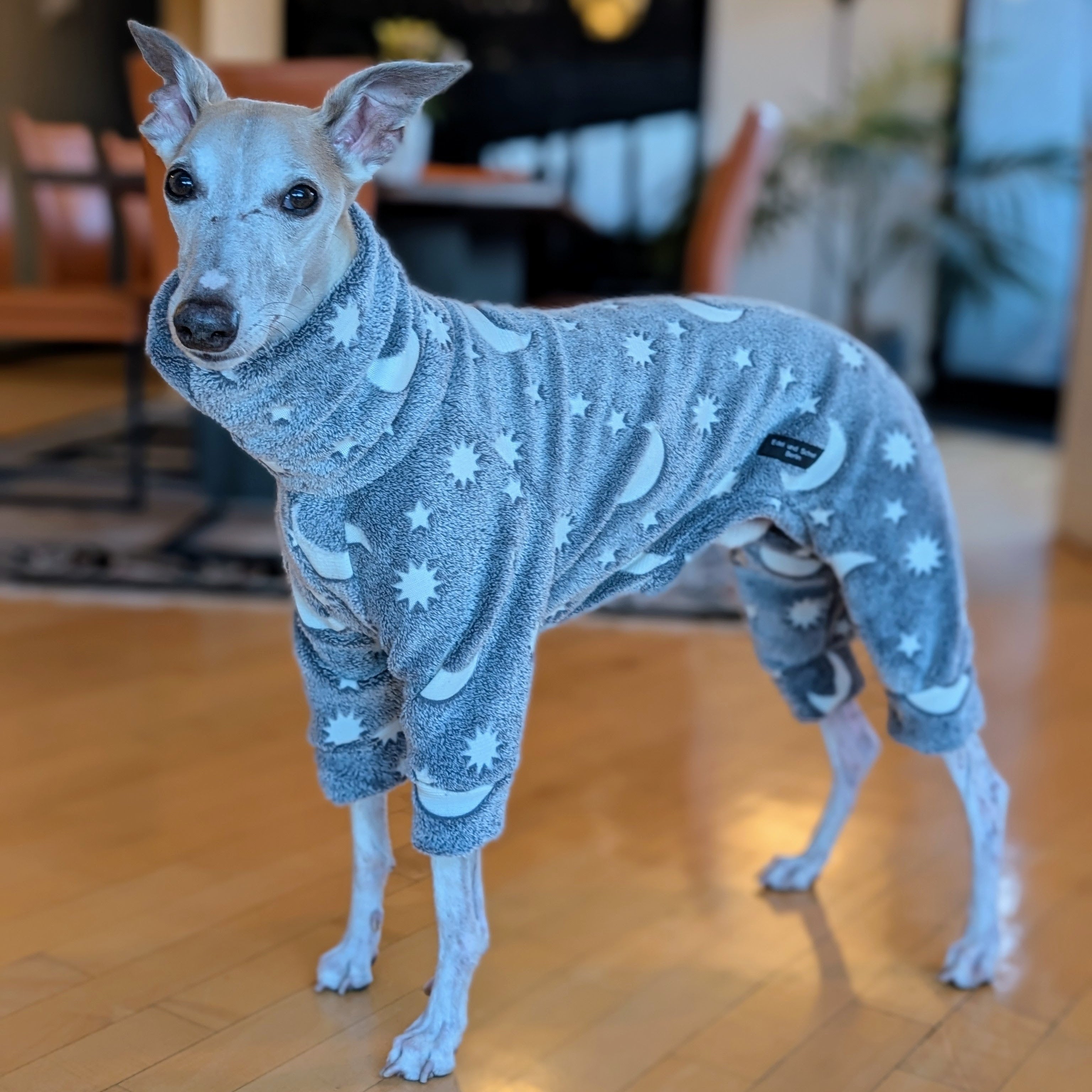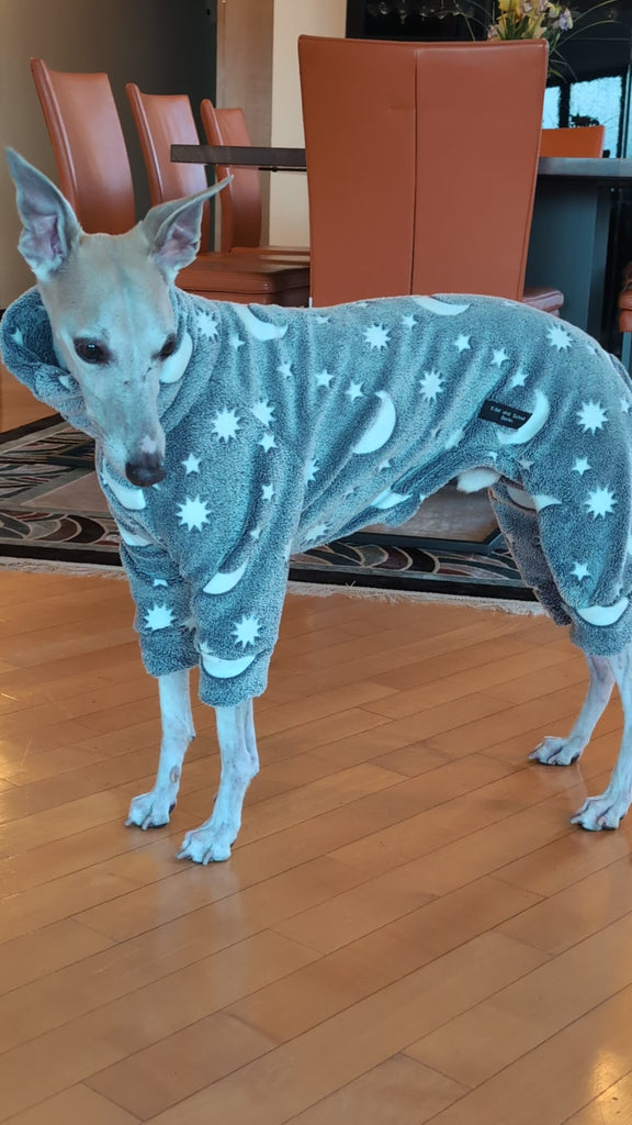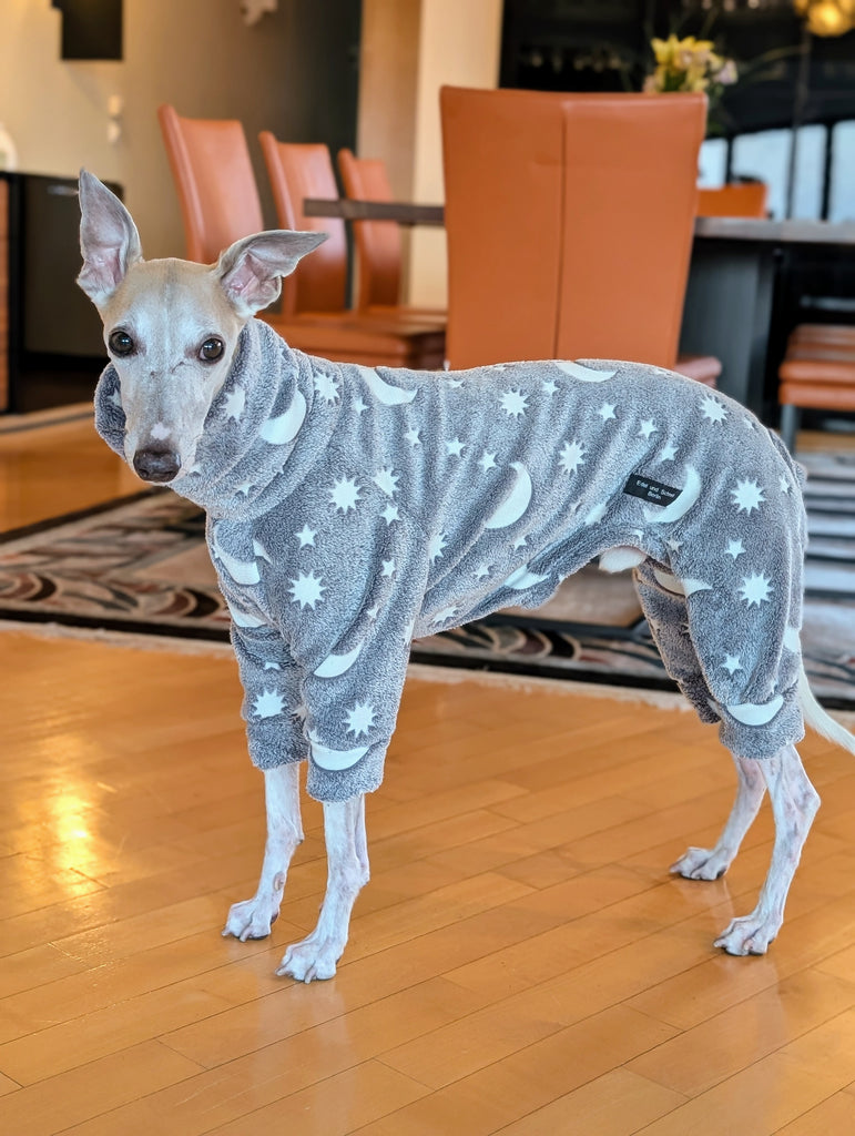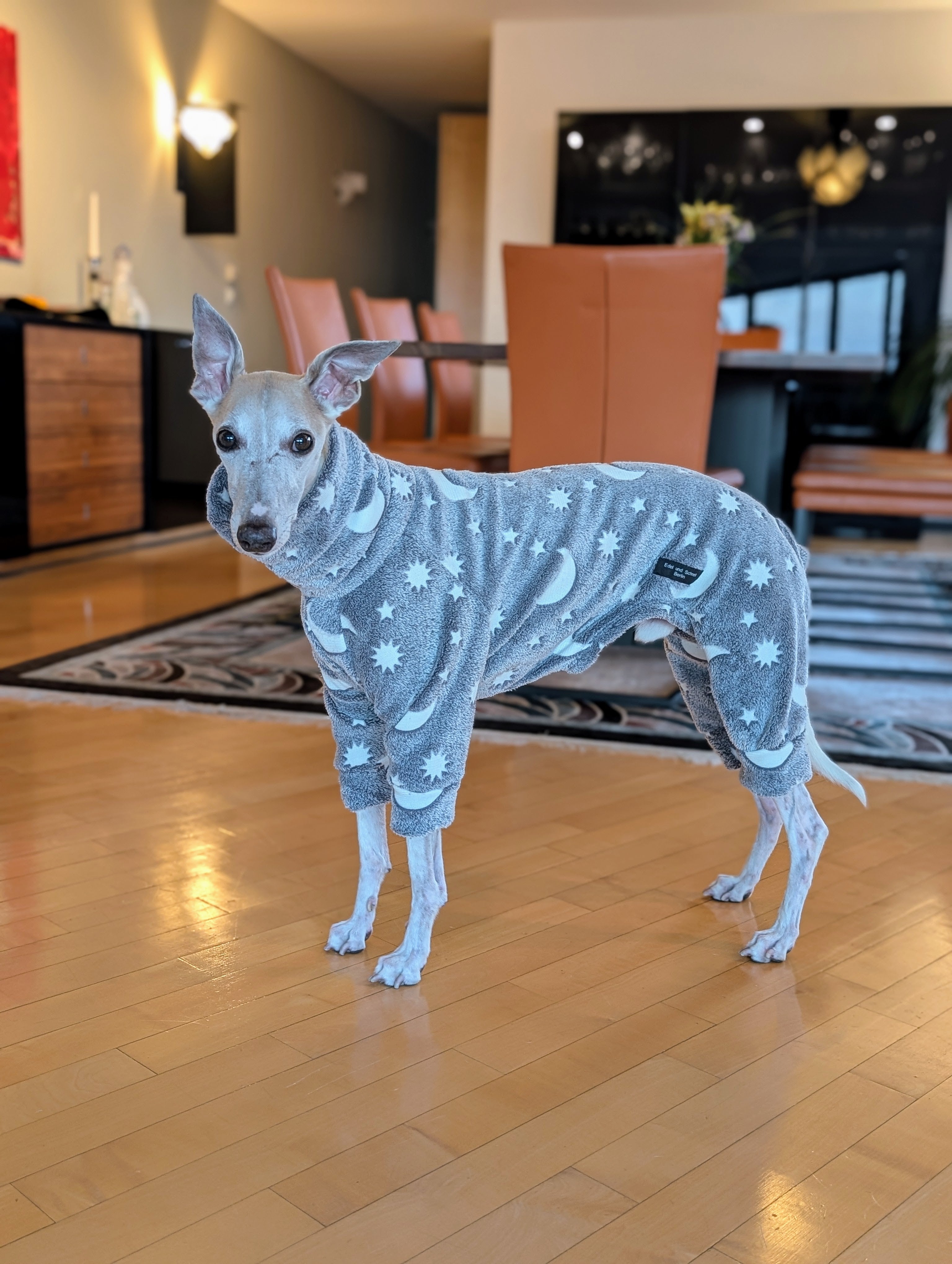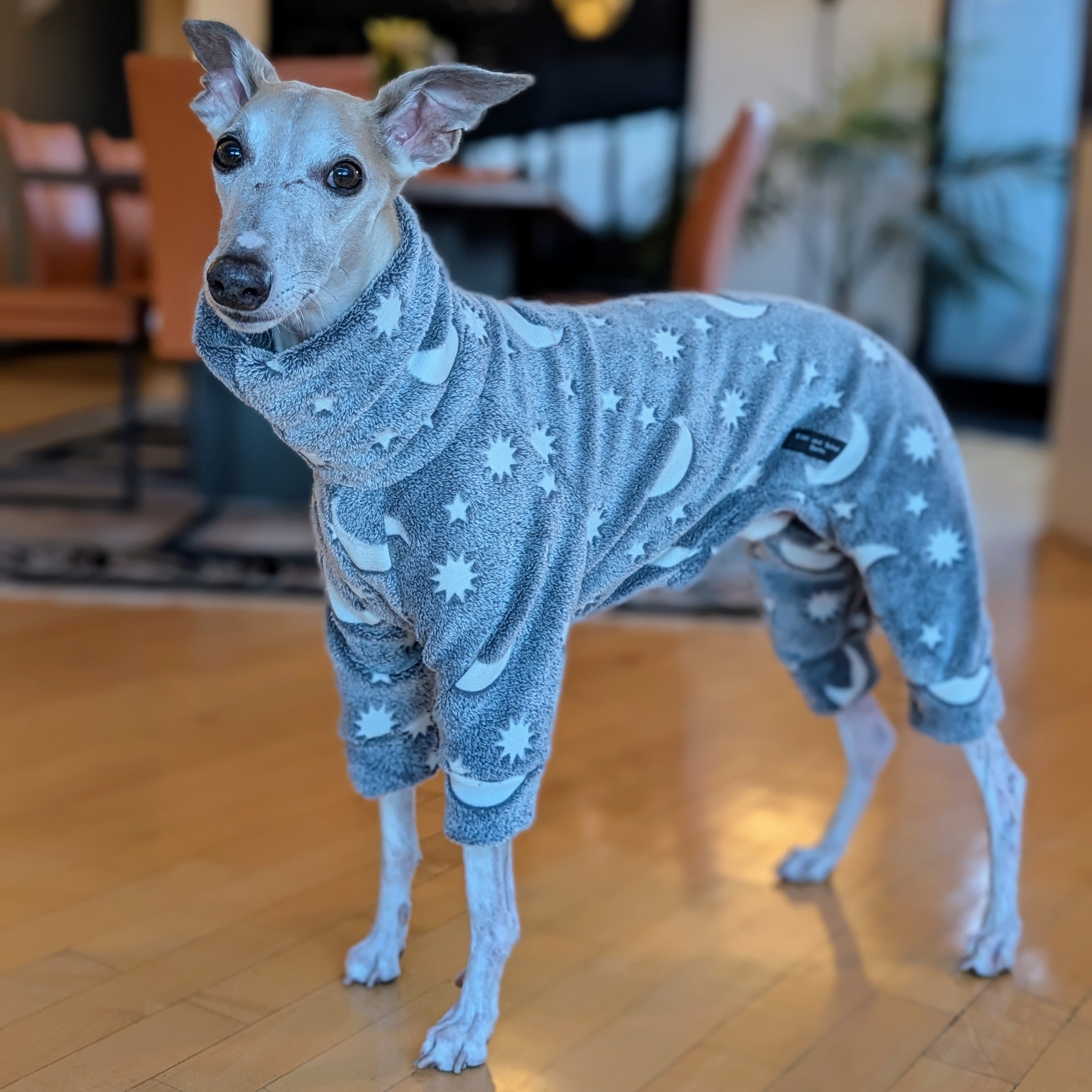 Der Wellness-Fleece Pyjama „Glow in the Dark“ kombiniert maximalen Kuschelkomfort mit einem besonderen Effekt: Die Mond- und Sternenmotive leuchten sanft im Dunkeln. Perfekt für Zuhause, kalte Tage und gemütliche Abende. Besonders geeignet für frostempfindliche Hunde und Windhunde. Die kleinen Größen haben wir Mitte Dezember wieder im Lager, sie können vorbestellt werden.