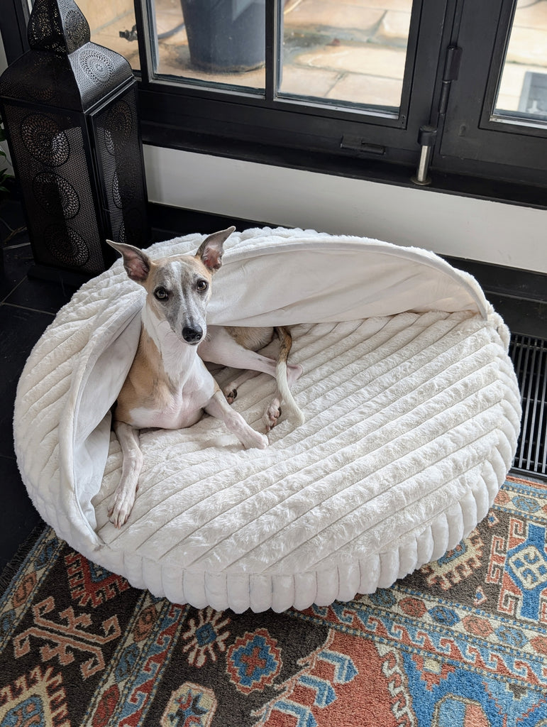 Sie erwerben hier ein Set aus unserem klassischen Cord Hundebett in Sand und einem extra Bezug mit Kuschelhöhle zum überziehen.