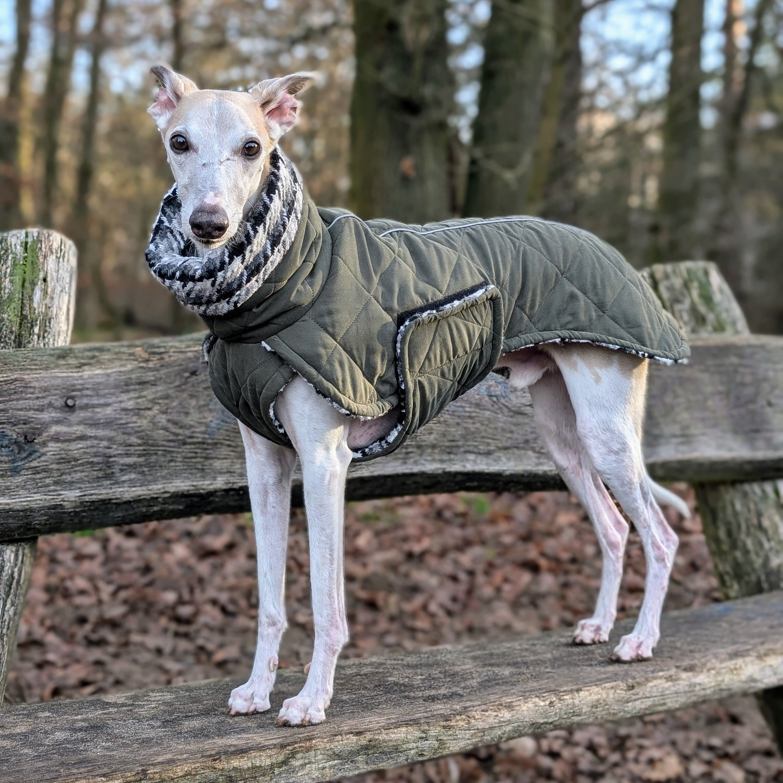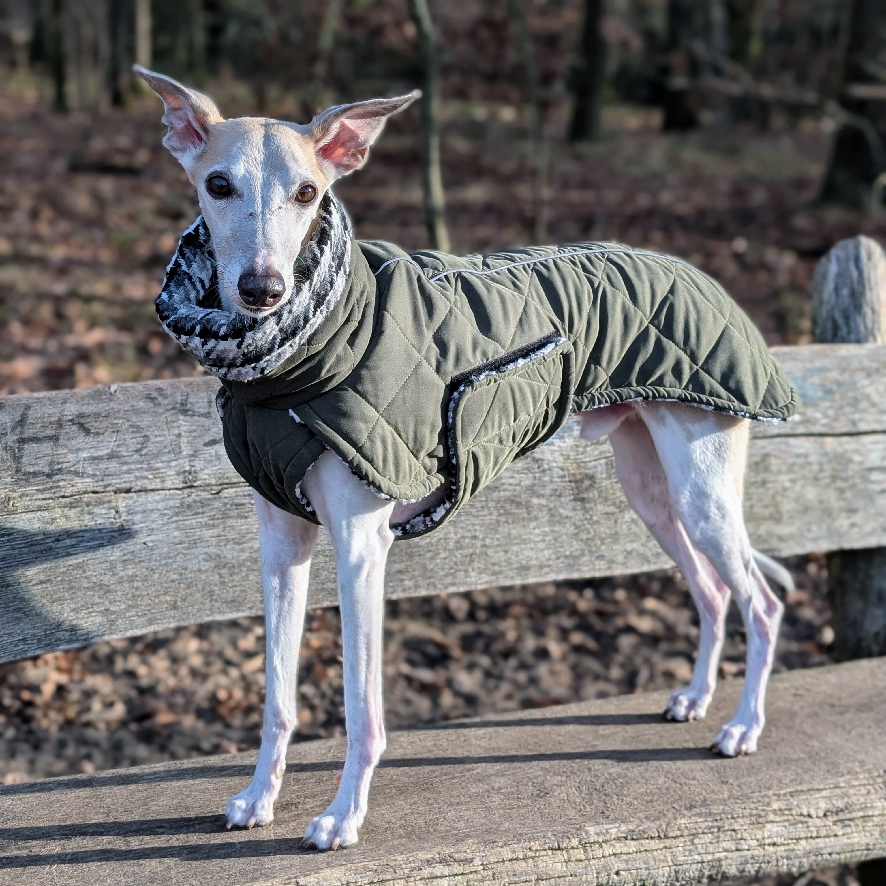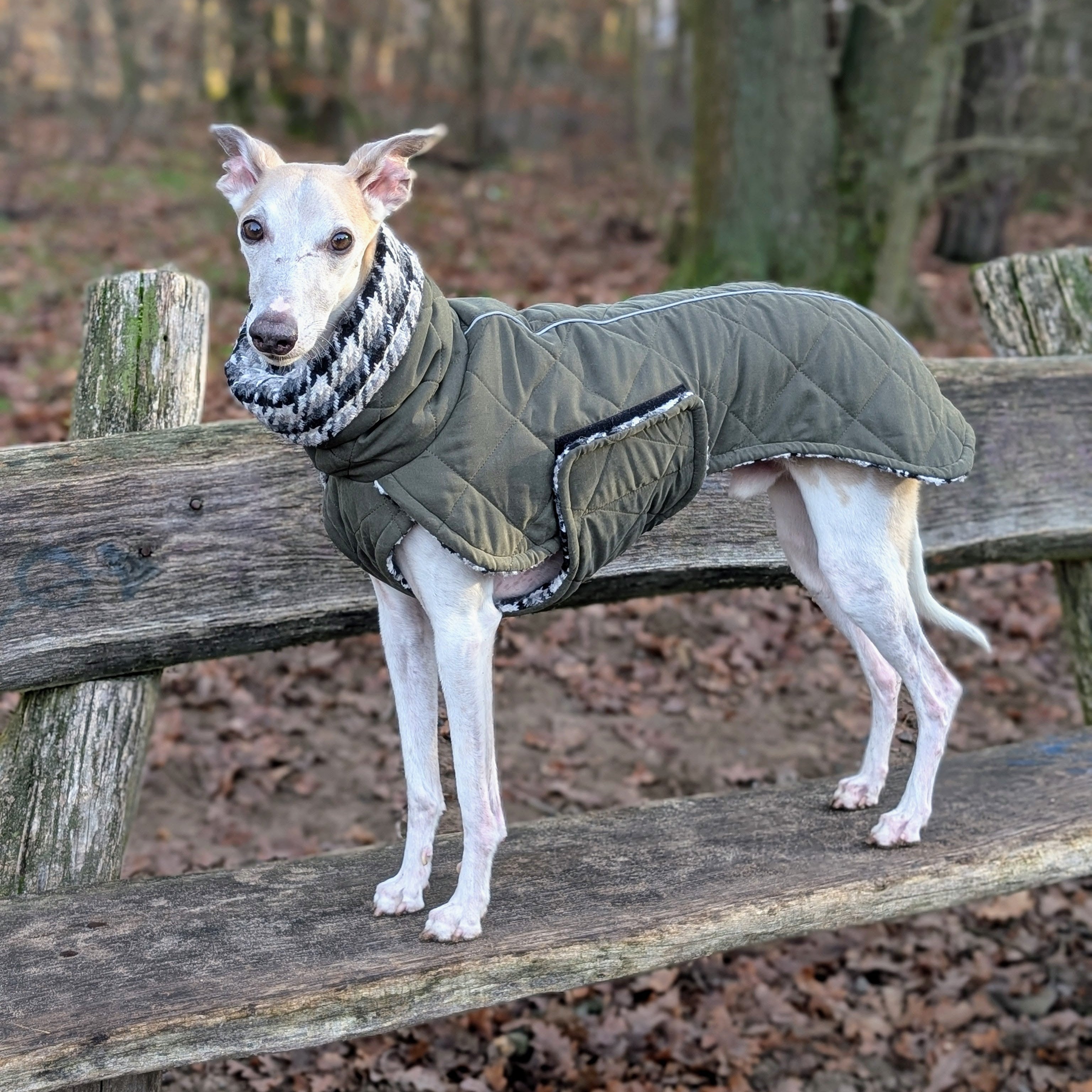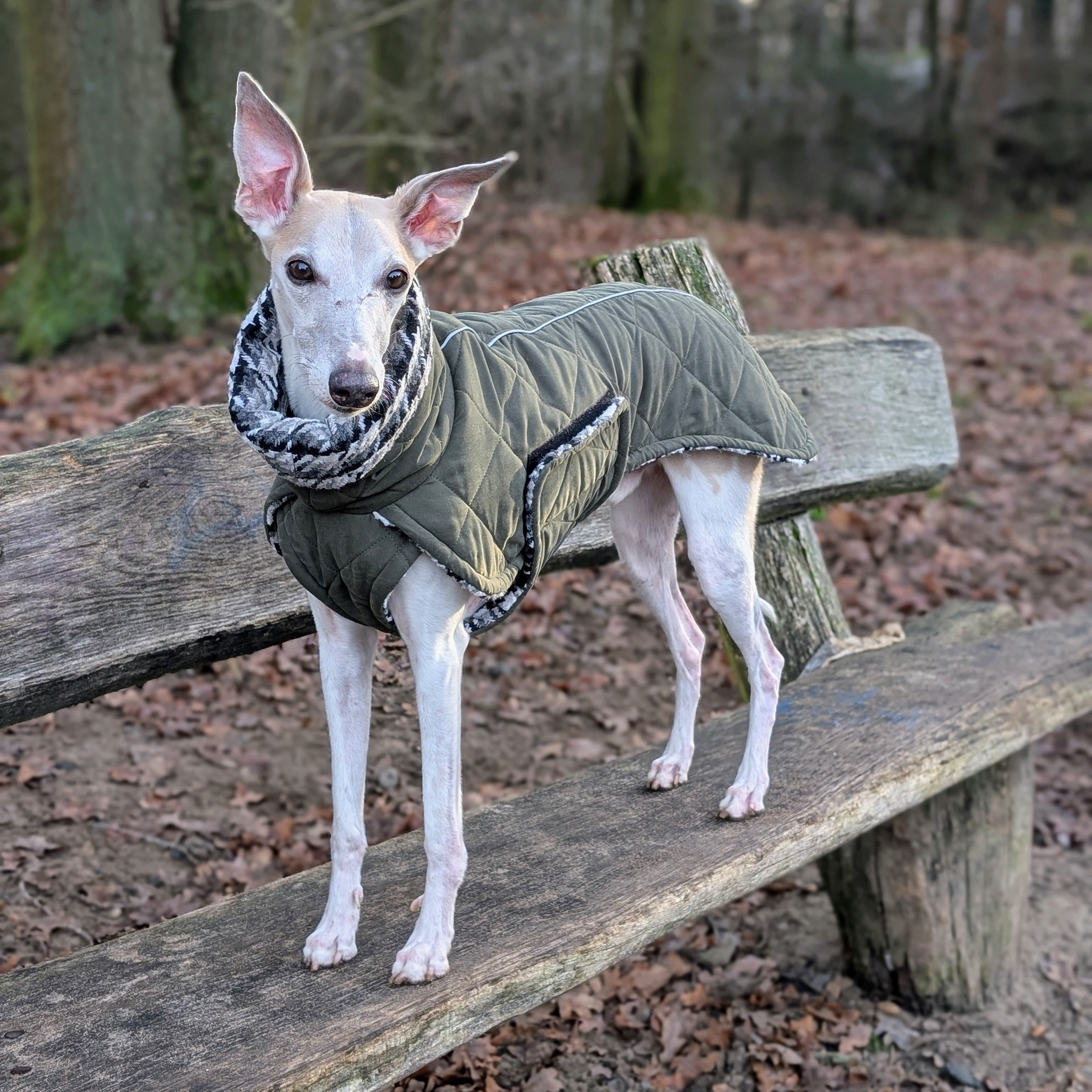 Dieser klassische grüne Hundemantel vereint zeitlosen Stil mit hochwertiger Funktionalität. Der elegante, lange Kragen schützt den Hals- und Nackenbereich zuverlässig vor Kälte und Wind und unterstreicht die ruhige, klassische Linienführung des Designs. Im Inneren sorgt ein extra dickes, warmes Wollfutter im edlen Karo-Look in Kombination mit hochwertiger Wattierung für intensive Wärmeisolierung – ideal für kalte Wintertage und Hunde mit höherem Wärmebedarf. Der lange, elegante Schnitt bietet optimalen Schutz für Rücken und Körper, während das integrierte Leinenloch ein komfortables Tragen mit Geschirr ermöglicht. Die praktische Bauchschließe mit hochwertigem Klettverschluss sorgt für einfaches An- und Ausziehen sowie sicheren Halt – funktional, durchdacht und komfortabel im Alltag. Ein hochwertiger Mantel für stilvolle Hunde, die es warm, komfortabel und anspruchsvoll mögen. Der Mantel ist der wärmste in unserem Shop.