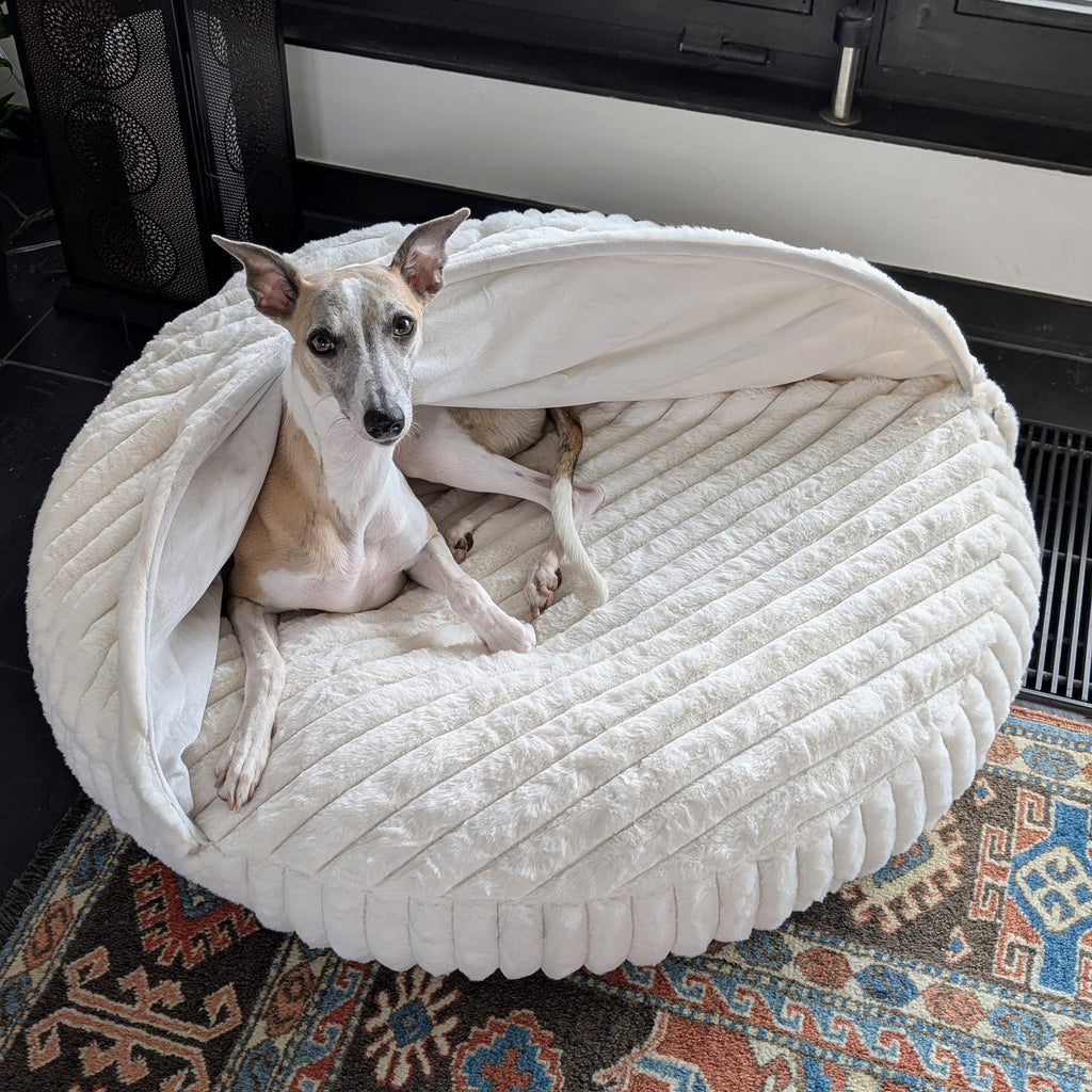 Hundebett- Bezug mit stehendem Deckel aus Luxus Kunstpelz, für Hunde die sich gerne einkuscheln