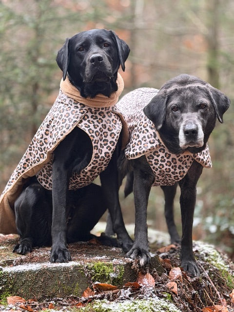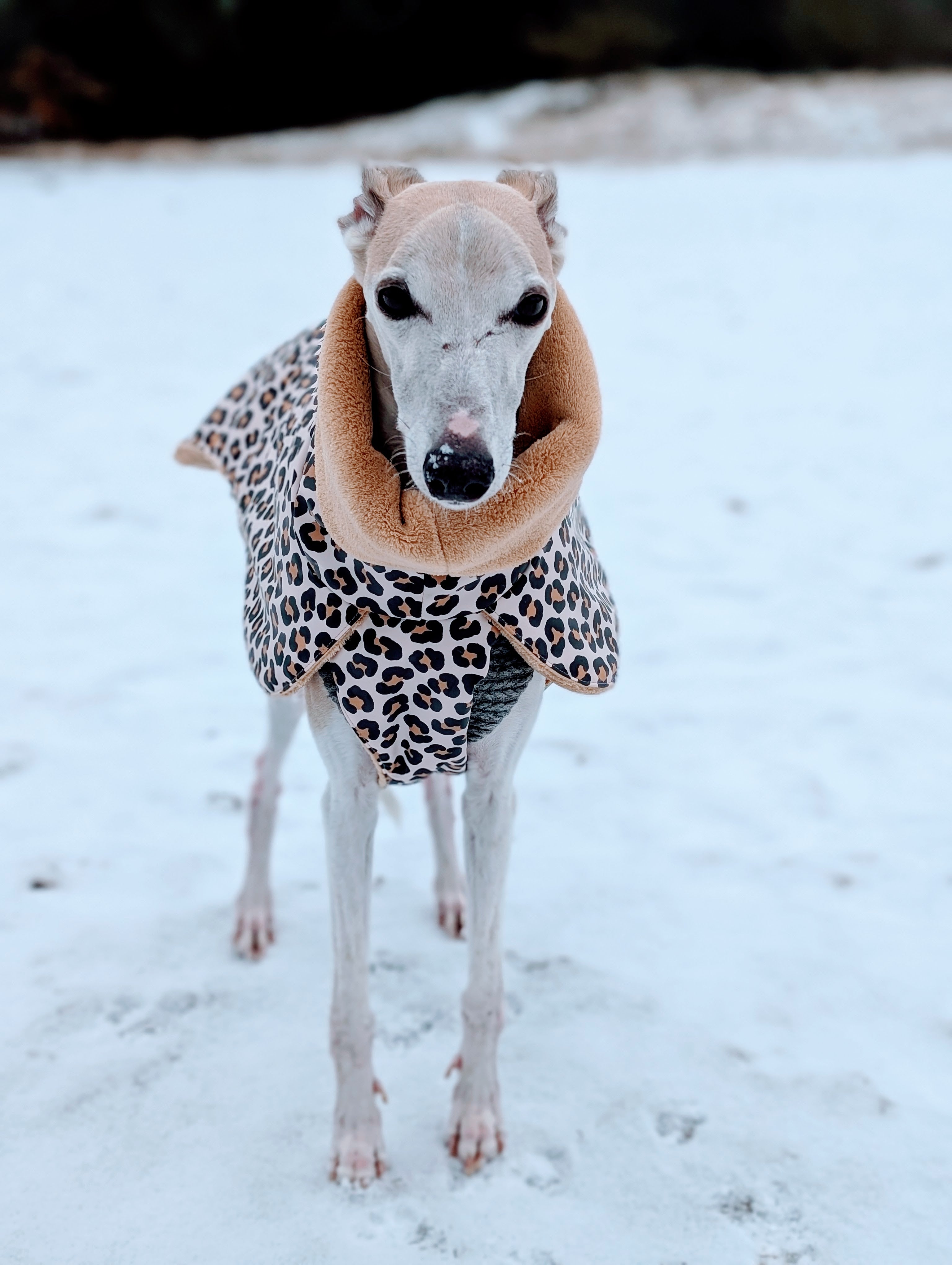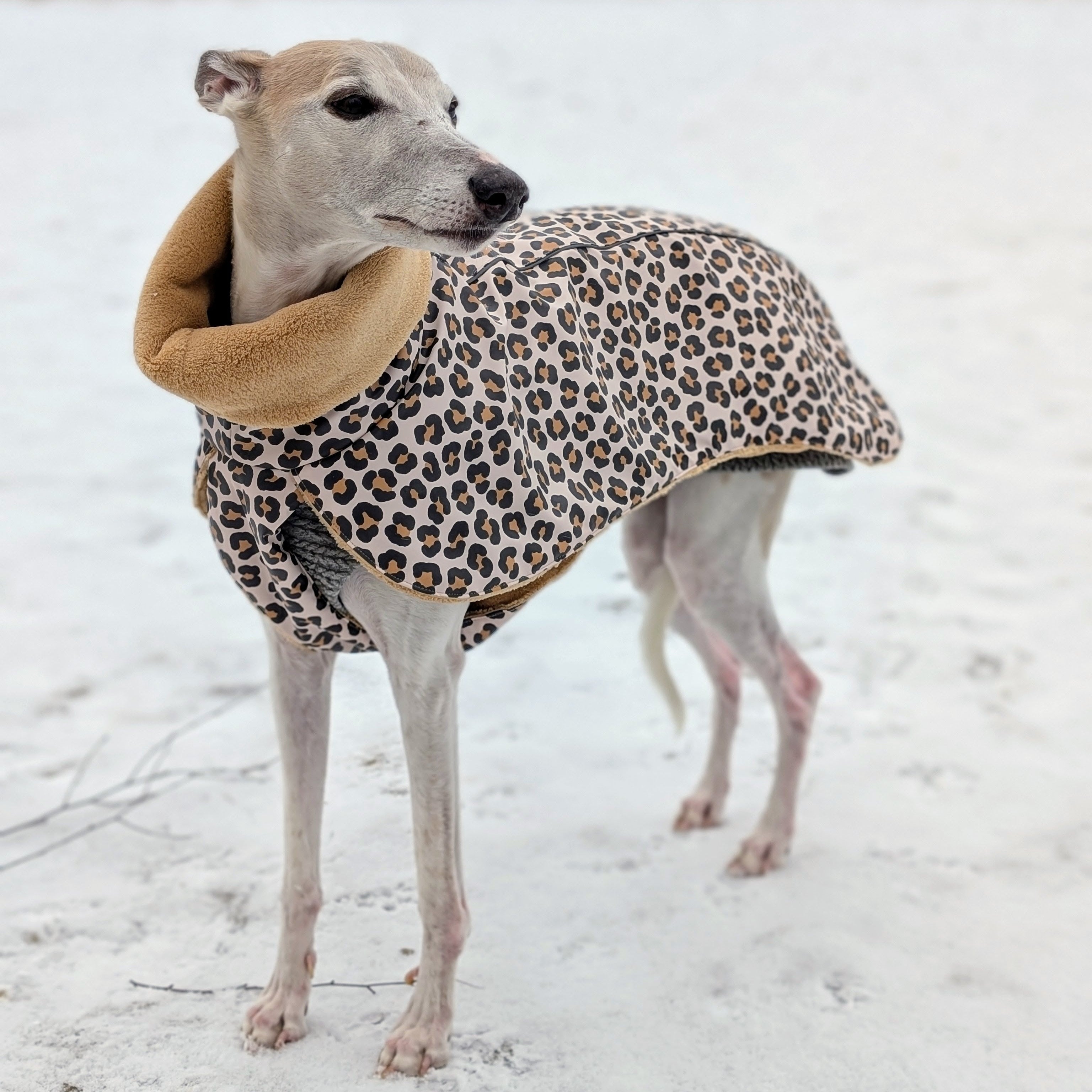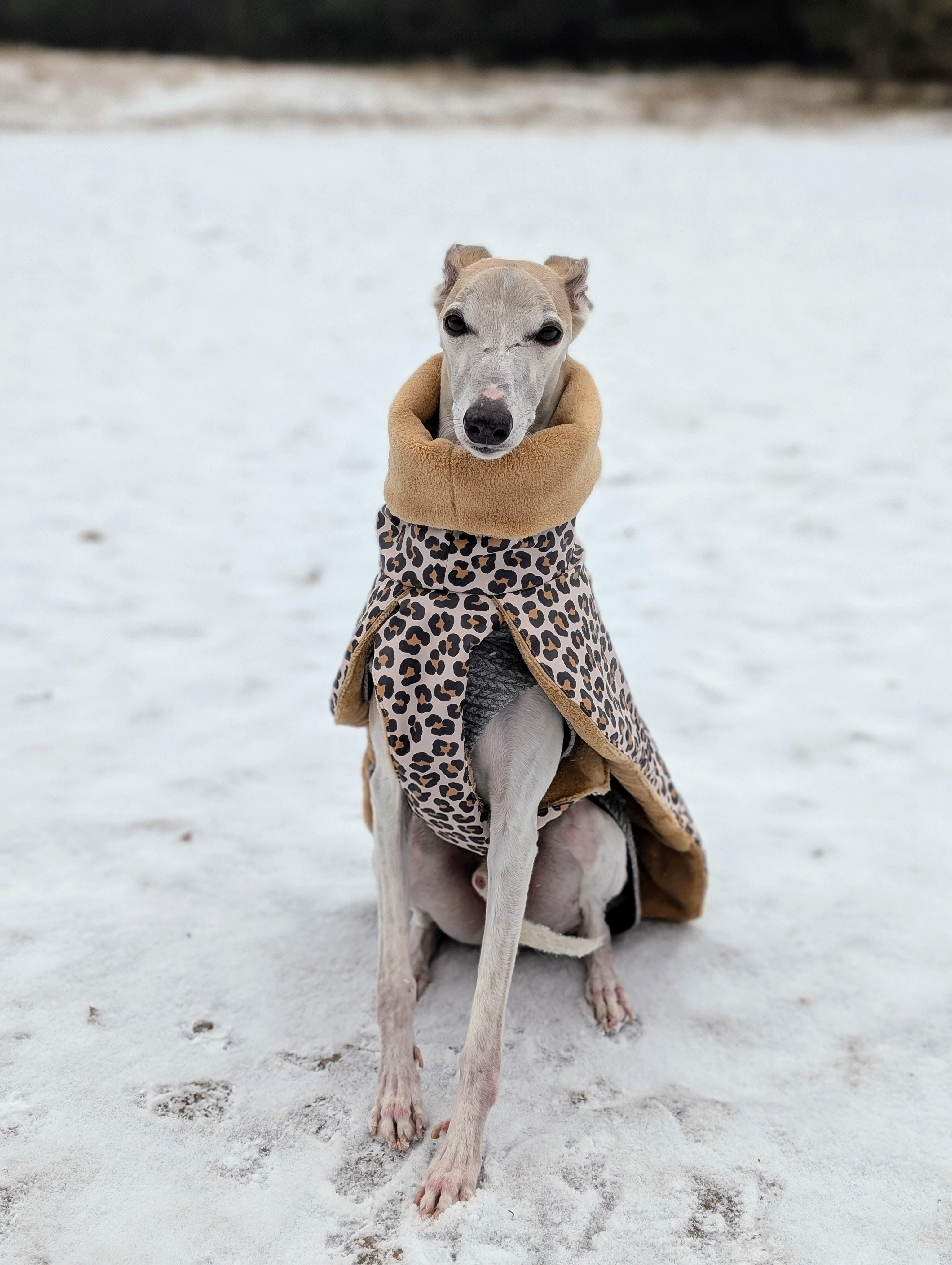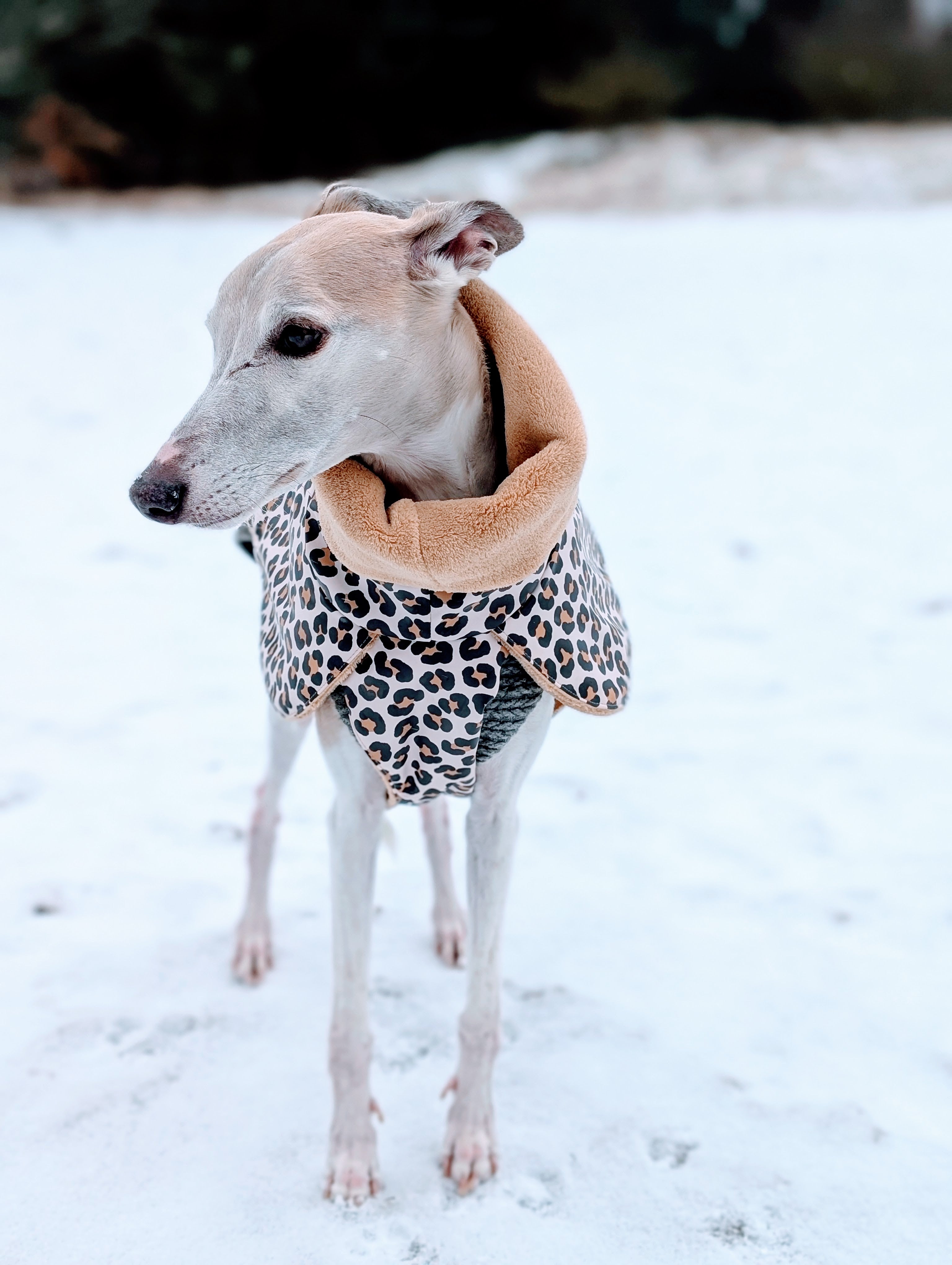 Der Regenmantel „Digital Leopard“ vereint modernes Design mit funktionaler High-Performance. Das wasserabweisende Aqua-Protect-Material schützt zuverlässig vor Regen und Wind, während das angenehm warme Coral-Fleece-Innenfutter in elegantem Caramelton für kuschelige Wärme sorgt. Eine zusätzliche Watteschicht bietet extra Isolation an kalten Tagen – perfekt für Spaziergänge bei Wind, Regen und winterlichen Temperaturen. Der verlängerte Schnitt schützt Rücken und Rutenansatz optimal und ist ideal für Windhunde und andere schlanke Hunderassen. Im Inneren sorgt ein innenliegender Klettverschluss für eine vollständig geschlossene Passform – dadurch ist der Mantel absolut regendicht und verhindert zuverlässig das Eindringen von Nässe. Leicht, flexibel und komfortabel – für maximale Bewegungsfreiheit bei gleichzeitigem Schutz. Perfekt für stilvolle Winterspaziergänge bei Regen und Kälte. 🐾✨