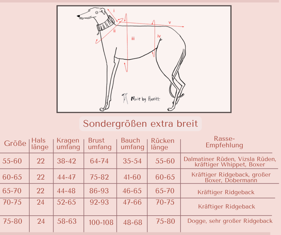 Hier finden Sie unsere Größentabelle: https://edelundschnell.com/pages/richtige-groesse-ihren-hund
