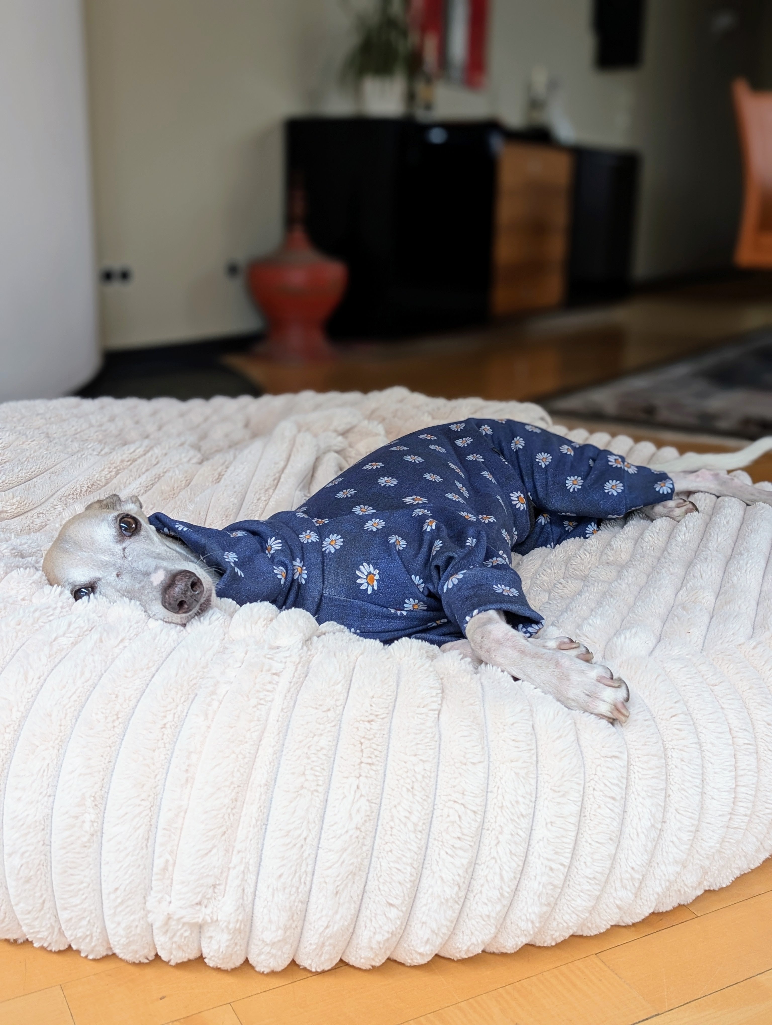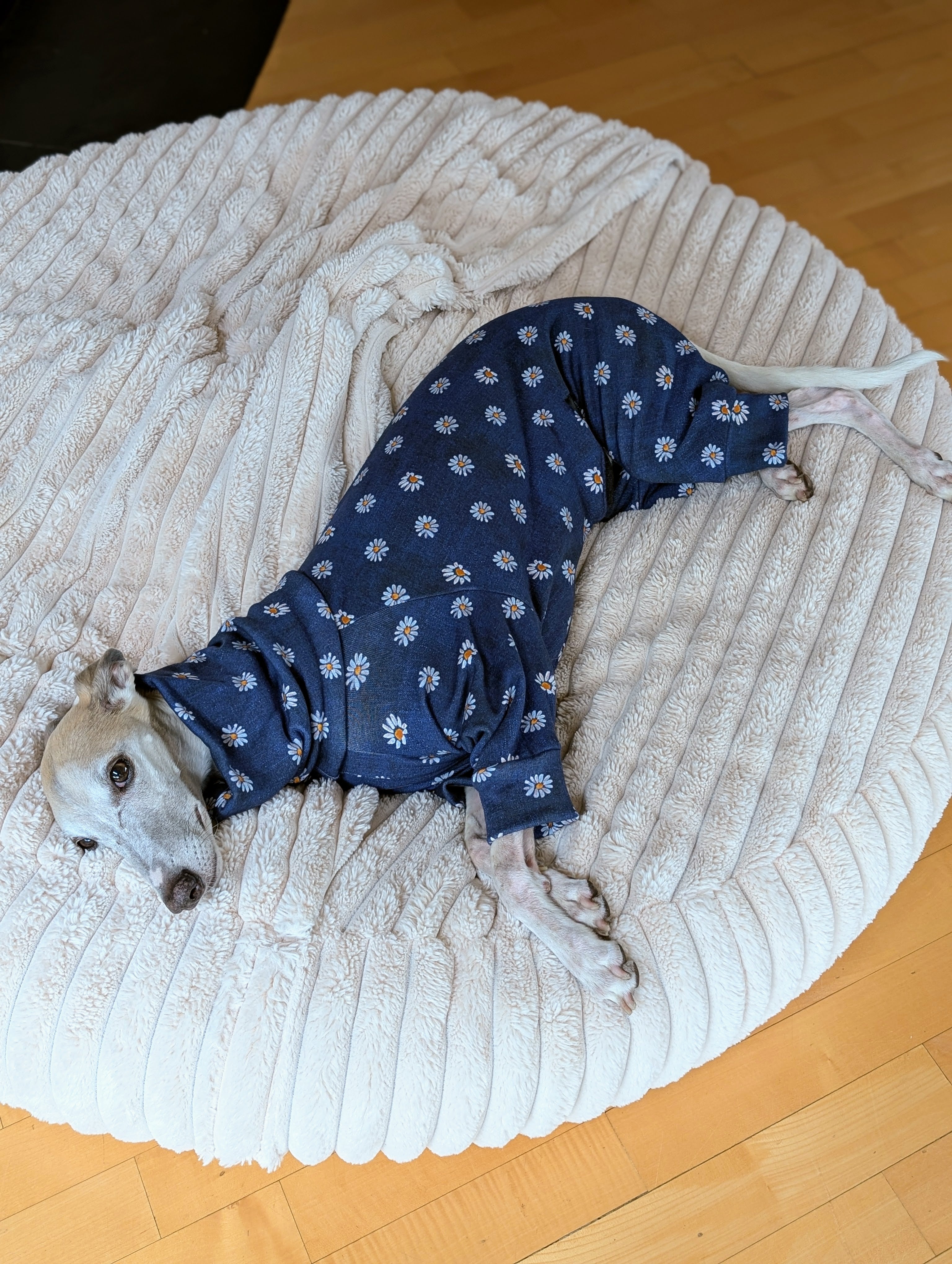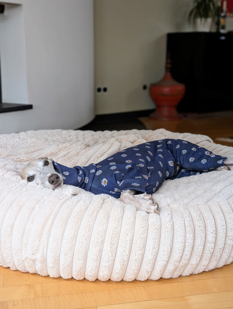 Hundepyjama aus Alpenfleece mit Baumwollanteil – Blau mit Margeriten, kuschelig & bequem