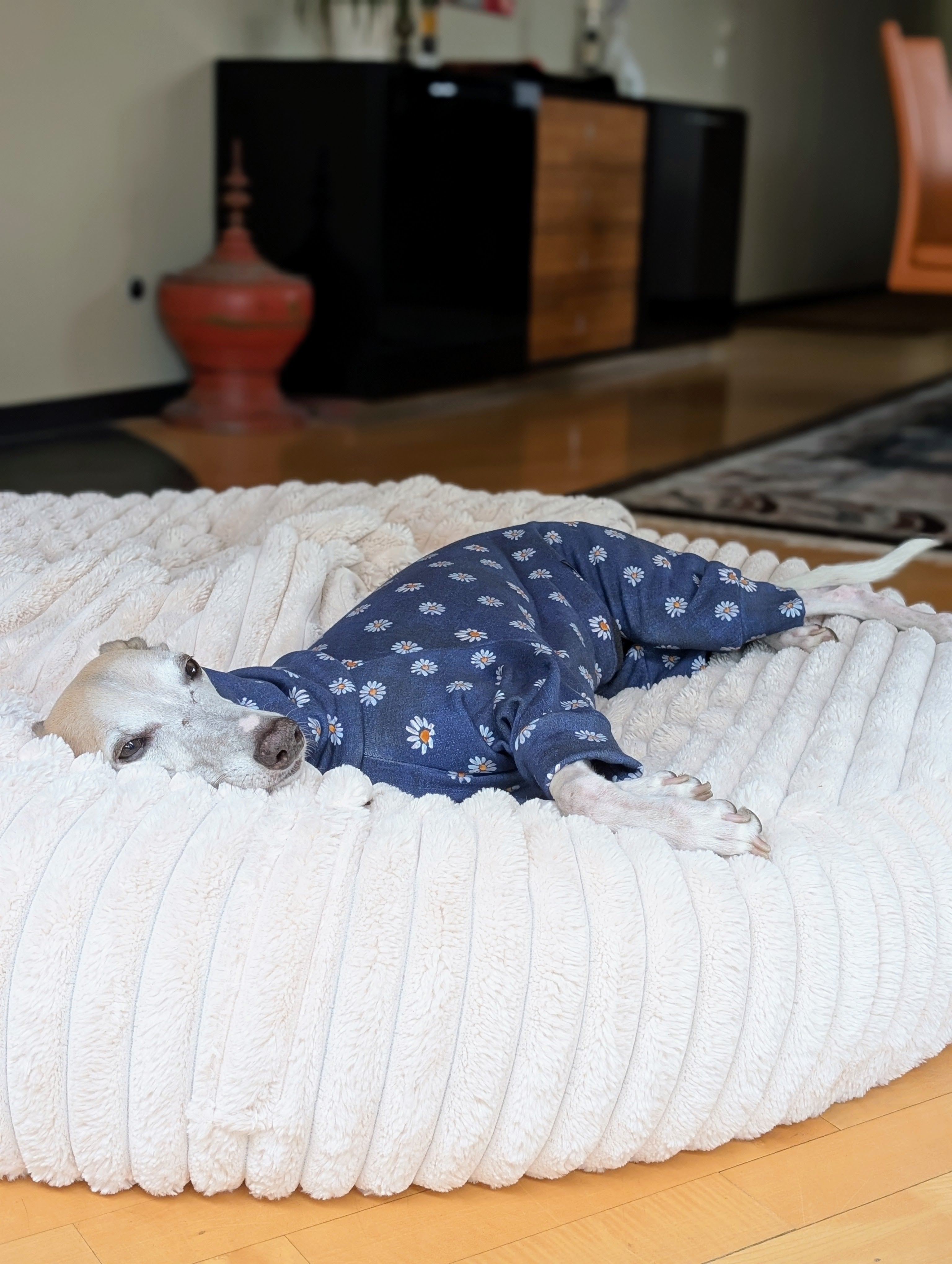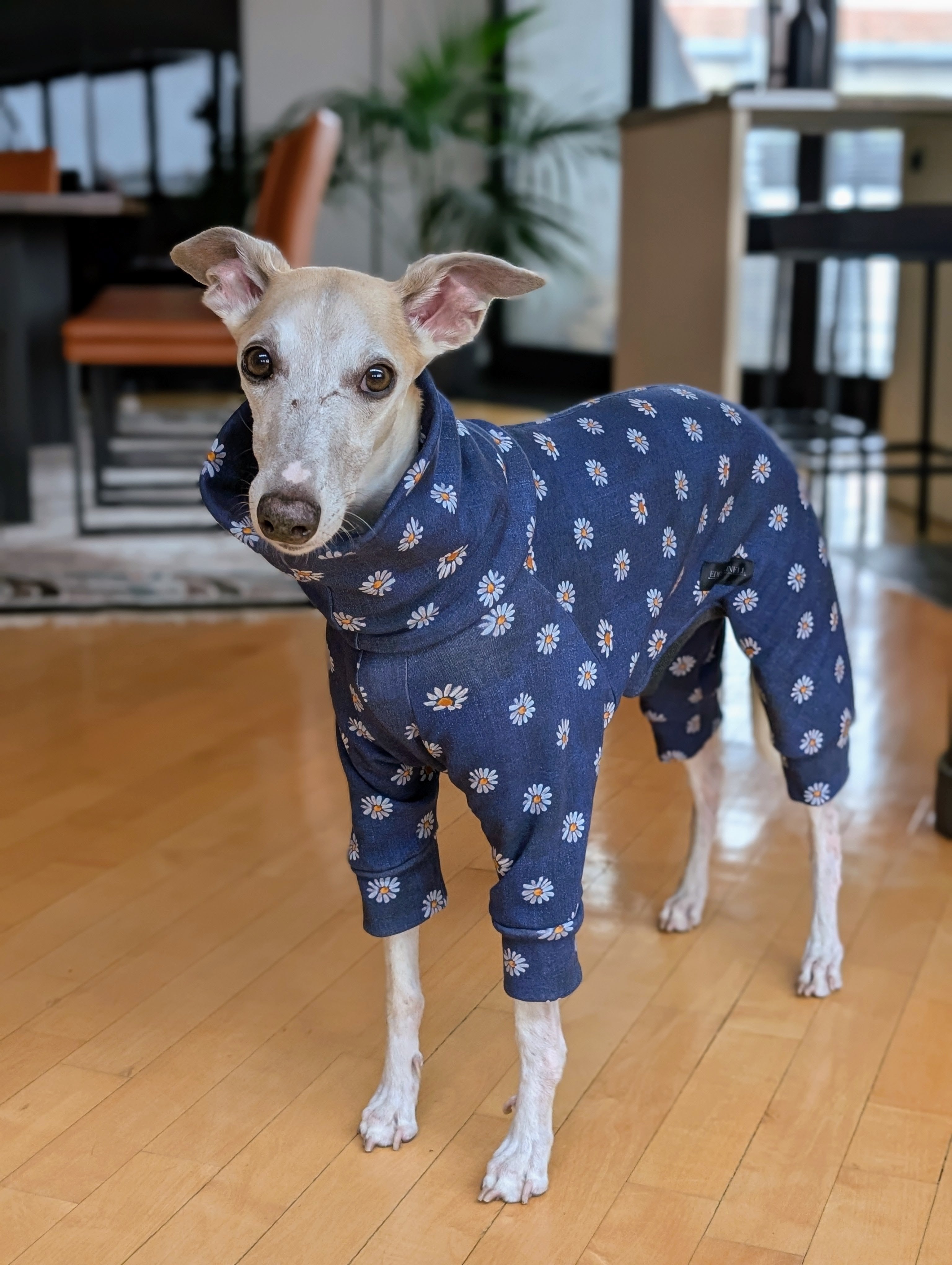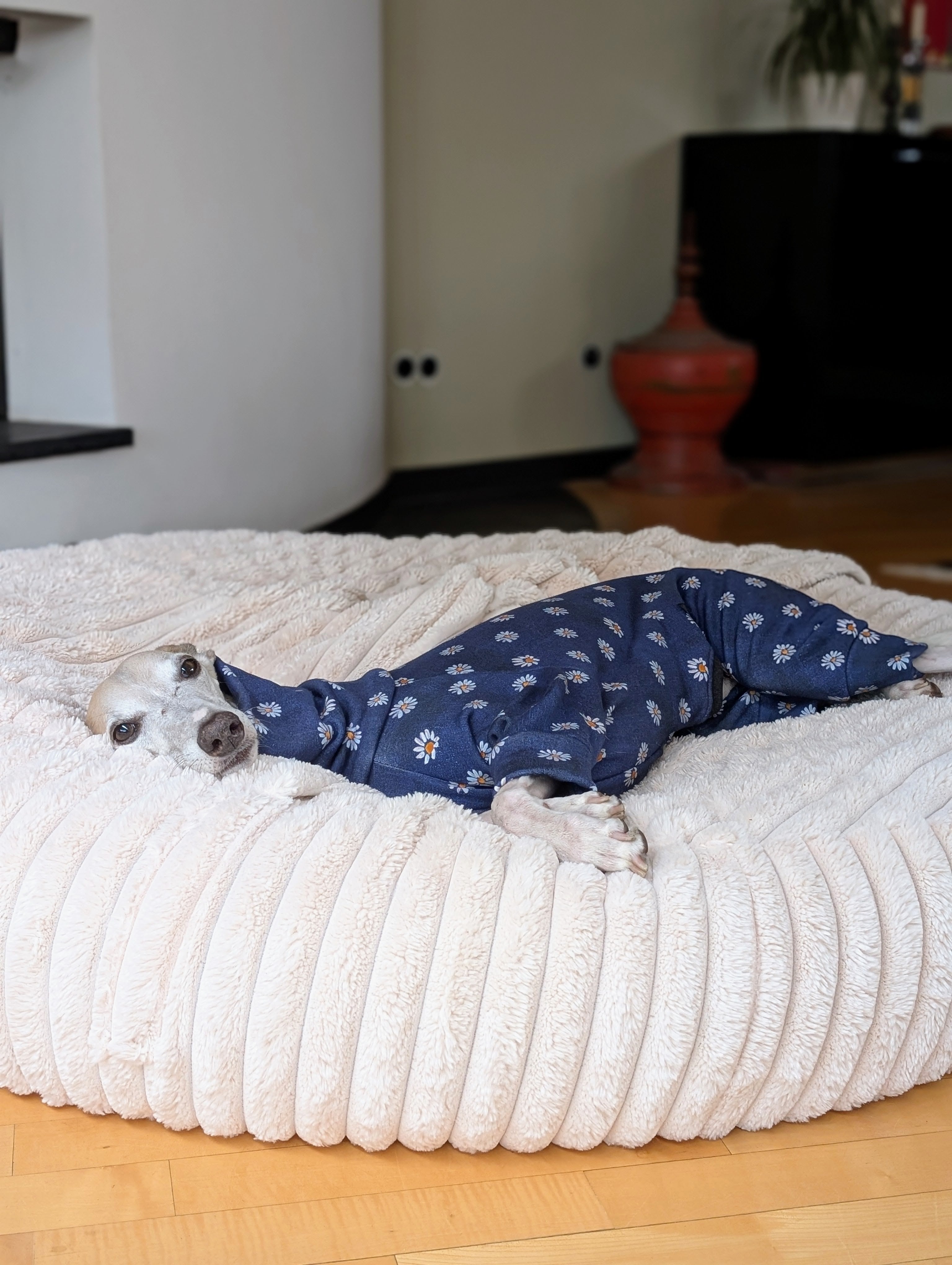 Hundepyjama aus Alpenfleece mit Baumwollanteil – Blau mit Margeriten, kuschelig & bequem